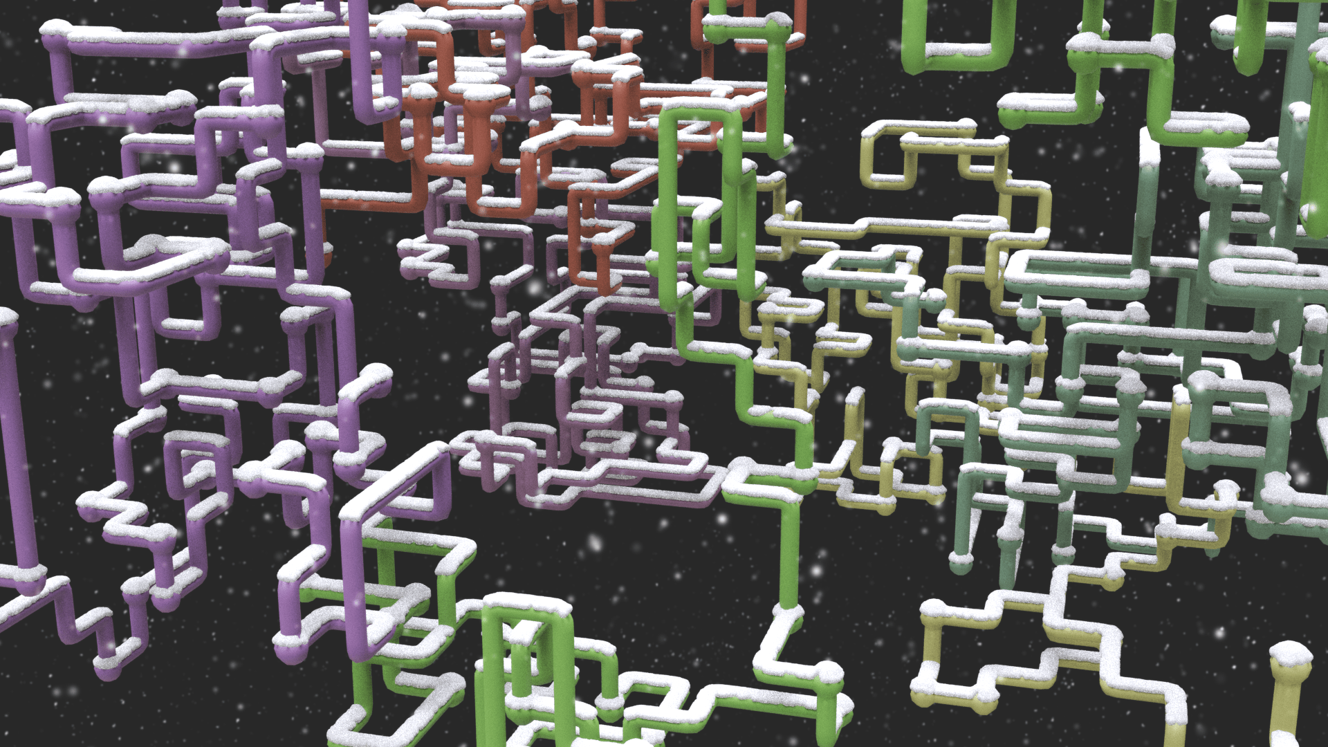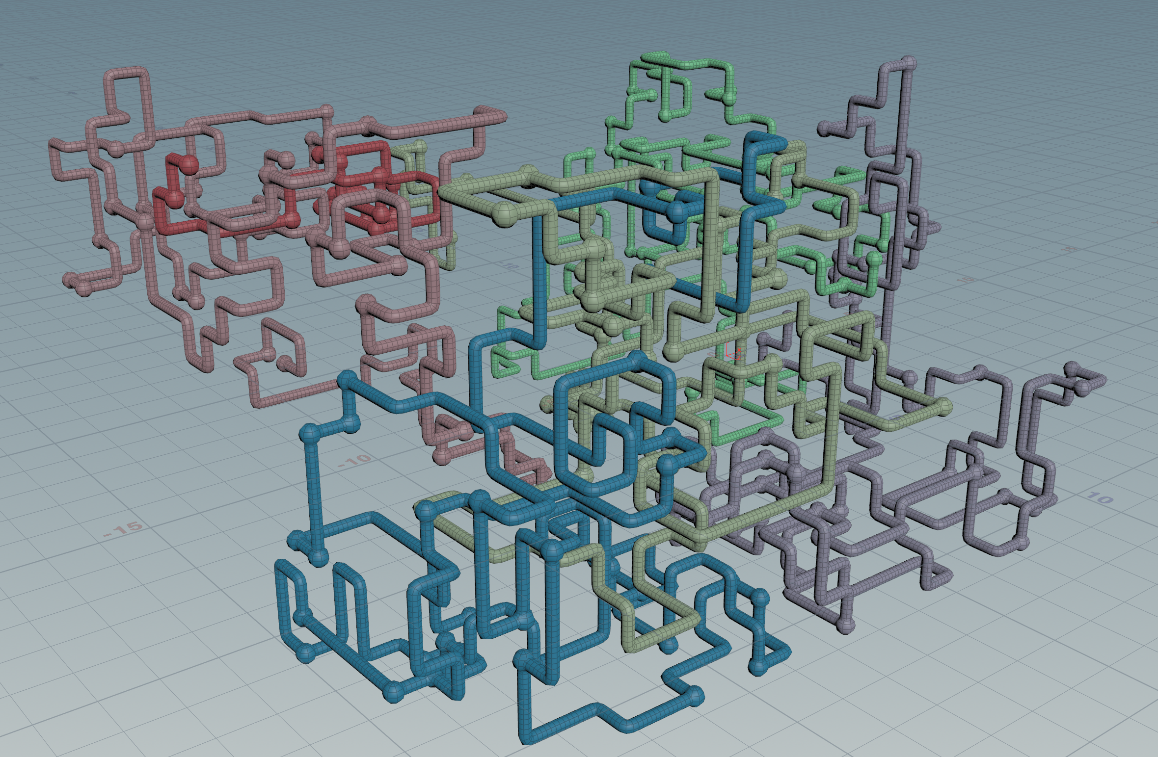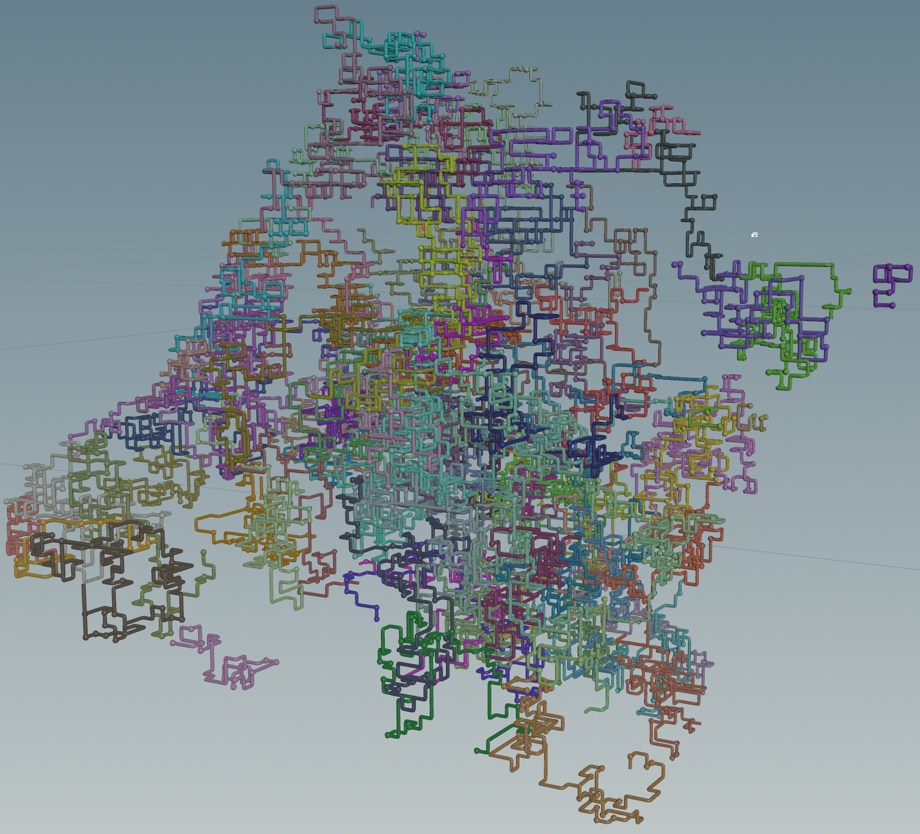 …and so on. In trying to figure out the best way to achieve this random pattern of movement, I started with an L-system with a simple set of turtle commands: it extended by one segment each frame and had equal probability of going straight, turning right, left, forward, or backward in space. However, this came with two limitations that I wasn't able to overcome: the line created by the system had no way of detecting if it was going to overlap itself, and it was very difficult to keep the system in a certain boundary.