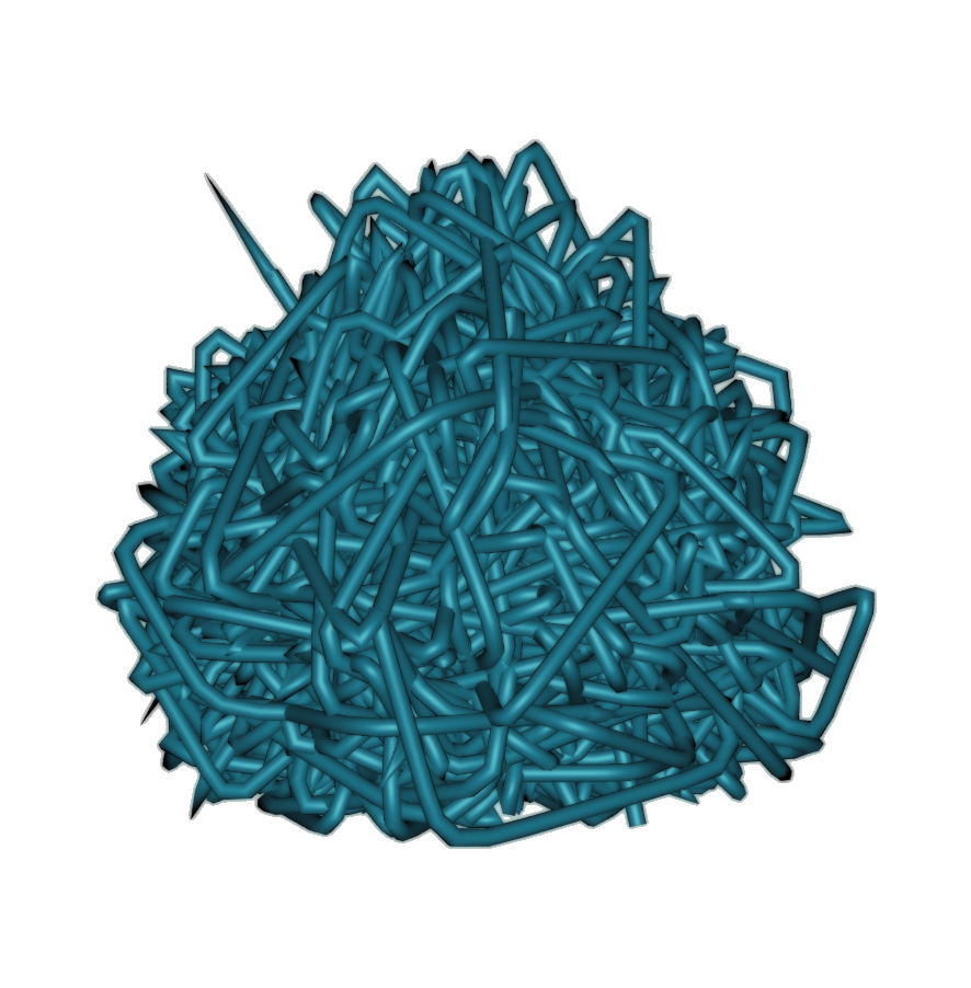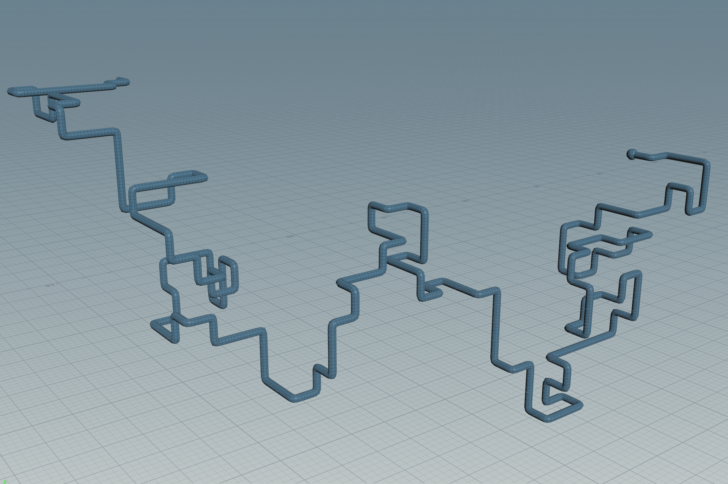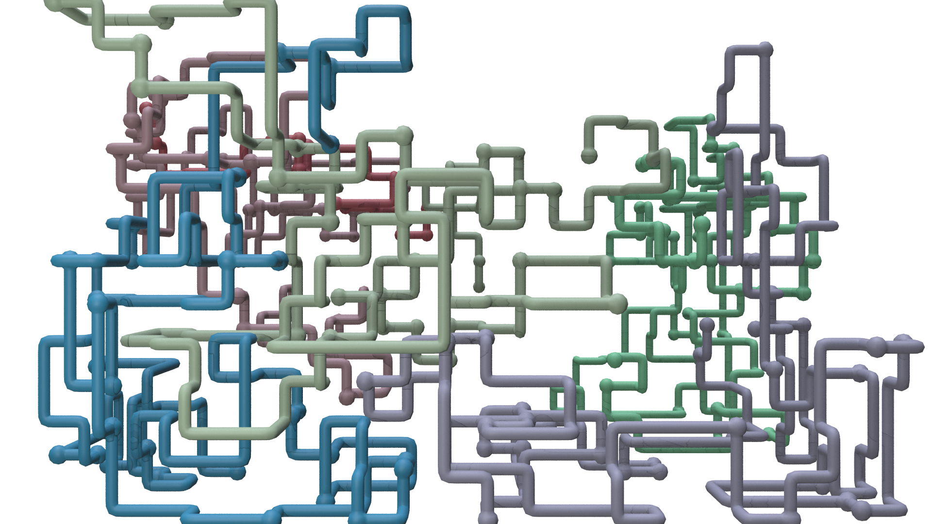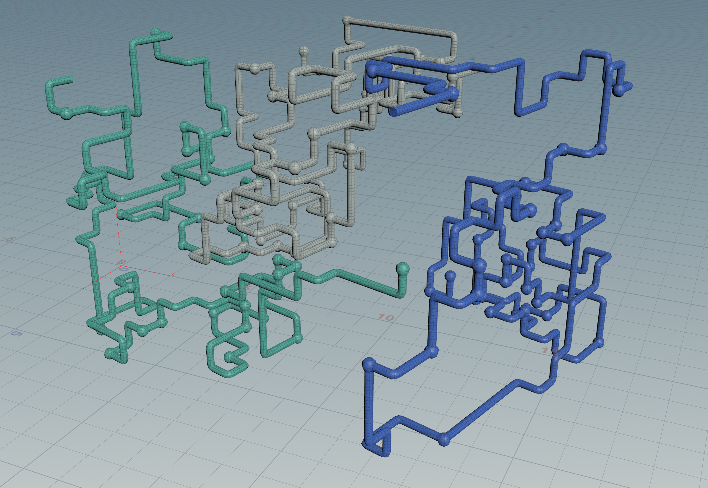 …and so on. In trying to figure out the best way to achieve this random pattern of movement, I started with an L-system with a simple set of turtle commands: it extended by one segment each frame and had equal probability of going straight, turning right, left, forward, or backward in space. However, this came with two limitations that I wasn't able to overcome: the line created by the system had no way of detecting if it was going to overlap itself, and it was very difficult to keep the system in a certain boundary.