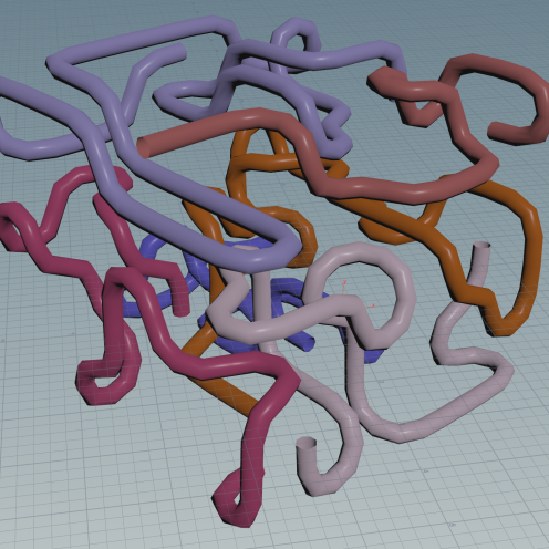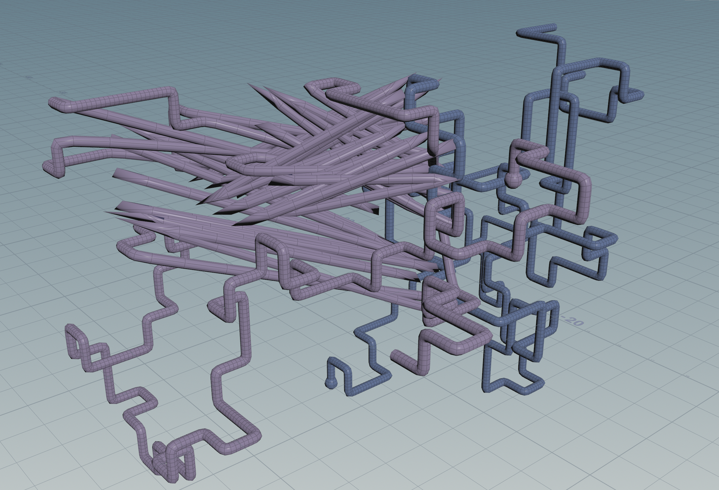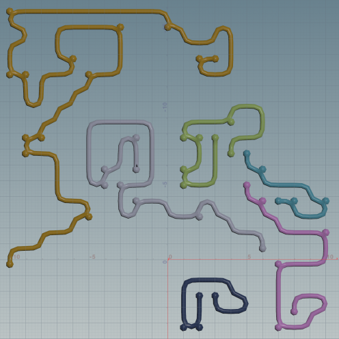 I loved that they used a dynamic system to generate source points from geometry using a VDB, instead of duplicating a grid of points like I was, so I immediately updated my project to match their source system. I also noted that they were using a solver SOP, instead of a foreach loop, and were dynamically generating any number of pipes inside the solver using a for loop. Updating my project with this system, I was also able to assign an attribute (@pipe_n) to identify each pipe, and color them randomly by multiplying a single random color by n (where n is the value of the pipe). This all worked beautifully — except for one (somewhat rare) frustrating case.